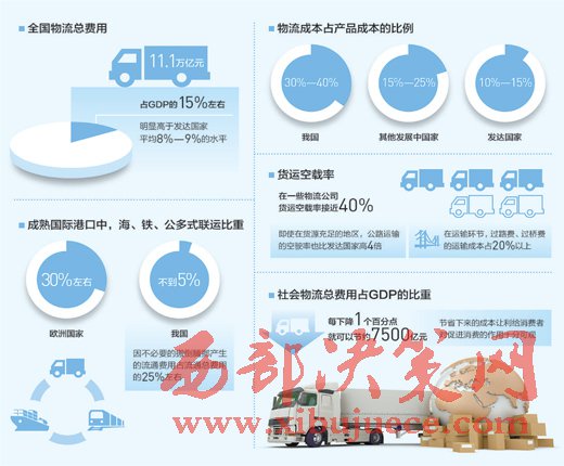 中國物流與采購聯(lián)合會副會長賀登才說,從物流過程看,在運輸、保管、管理三個物流環(huán)節(jié)中,我國流通成本高在保管、管理環(huán)節(jié)。去年,全國物流總費用為11.1萬億元,占GDP的15%左右,明顯高于發(fā)達國家平均8%—9%的水平,其中保管費用占33.1%,管理費用占13%。與發(fā)達國家相比,我國物流保管費用是它們的2倍,管理費用是其3至4倍。物流成本占產(chǎn)品成本的比例,我國大約在30%—40%,而其他發(fā)展中國家約為15%—25%,發(fā)達國家一般為10%—15%。