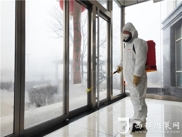 立春后的早晨,草地上仍然附著一層白茫茫的冰霜。陜北礦業(yè)檸條塔公司的公寓樓大廳里,武存照身穿白色防護(hù)服,手拎消毒箱,一邊默默地噴灑著刺鼻的84消毒水,一邊目不轉(zhuǎn)睛地盯著腳下,生怕漏掉一個角落。