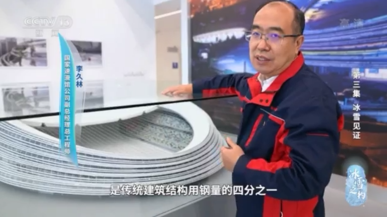 國家速滑館公司副總經(jīng)理、總工程師 李久林:通過張拉這個索,就像做網(wǎng)球拍一樣,只用了幾百噸的鋼絲就可以實現(xiàn)大型體育場館的屋頂,是傳統(tǒng)建筑結(jié)構(gòu)用鋼量的四分之一。
