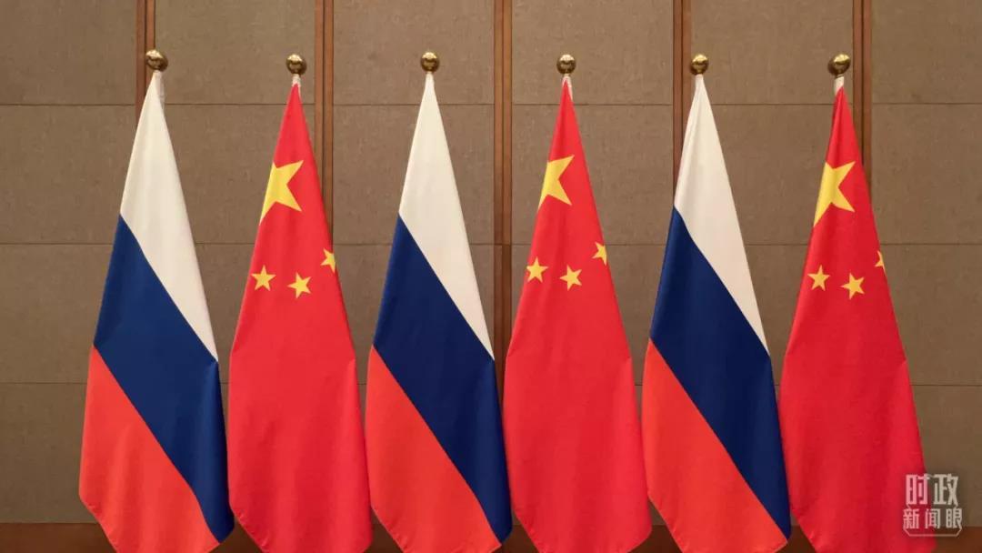 △2月4日,中俄兩國元首會談現(xiàn)場的兩國國旗。(總臺央視記者范學禹拍攝)
