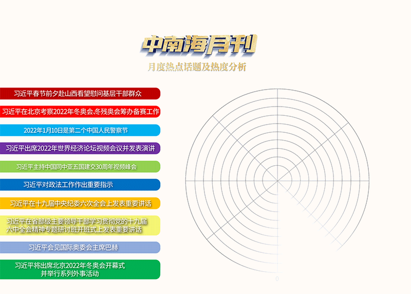 央視網(wǎng)“智聞”系統(tǒng)提取分析2022年1月時(shí)政熱點(diǎn)新聞,總書記兩赴地方考察、出席2022年世界經(jīng)濟(jì)論壇視頻會(huì)議、主持中國(guó)同中亞五國(guó)建交30周年視頻峰會(huì)等相關(guān)話題備受關(guān)注。