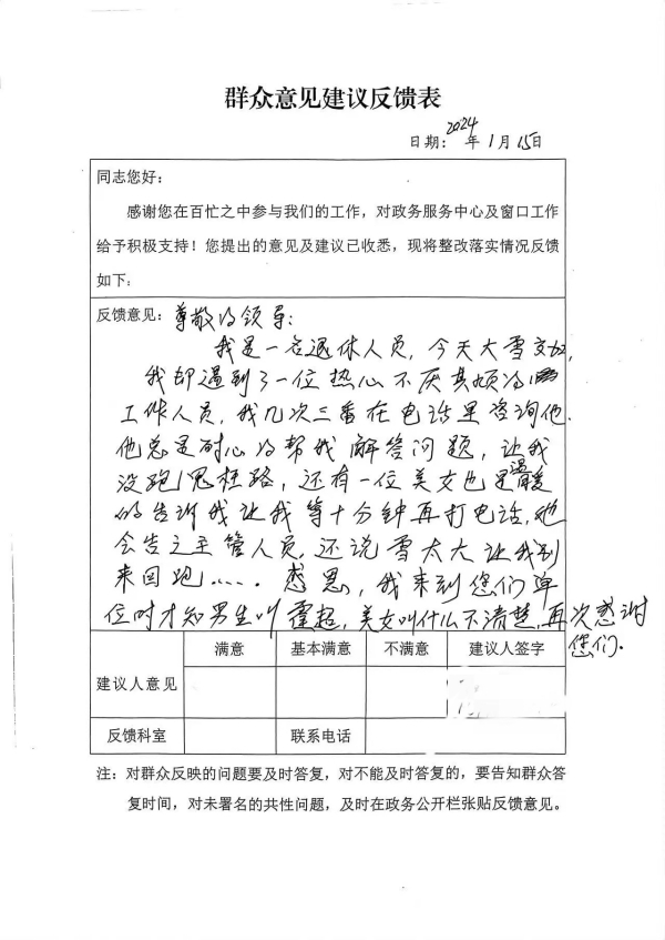 “今日大雪交加,我卻遇到了一位熱心細心、不厭其煩的工作人員,我?guī)状稳陔娫捓镒稍兯?,他總是耐心的幫我解決問題,讓我沒跑冤枉路,還有一位美女也是溫暖的告訴我,讓我等十分鐘再打電話,她會告知主管人員,還說雪太大讓我別來回跑,感恩......我來到您們單位時才知男生叫霍超,美女叫什么不清楚,再次感謝您們!”市民雷女士在群眾意見反饋簿上,用“熱心、耐心、溫暖、感恩、感謝”等贊許,表達了對政務大廳工作人員的肯定。