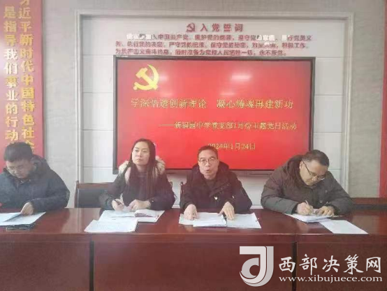 西部決策網(wǎng)訊(記者帥華鋒 張隴峰)為深入開展學(xué)習(xí)貫徹習(xí)近平新時(shí)代中國(guó)特色社會(huì)主義思想主題教育,貫徹落實(shí)黨的二十大精神,增強(qiáng)基層黨組織凝聚力和戰(zhàn)斗力,錘煉黨員黨性,凝心聚力,擔(dān)當(dāng)作為,立足崗位作貢獻(xiàn),1月24日,寶雞市金臺(tái)區(qū)新福園中學(xué)黨支部舉行主題為“學(xué)深悟透創(chuàng)新理論,凝心鑄魂再建新功”的主題黨日活動(dòng)。本次活動(dòng)由黨支部書記王鐵昌主持。校長(zhǎng)安開琴應(yīng)邀列席。