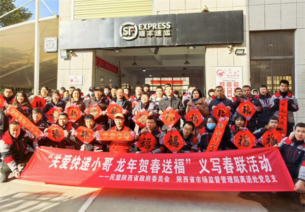 歡聲笑語辭舊歲,暖意融融迎新春。2024年1月23日,民盟省政府委員會(huì)攜手省市場(chǎng)監(jiān)管局離退處黨總支走進(jìn)高新科技八路順豐速運(yùn)營業(yè)點(diǎn)開展“關(guān)愛快遞小哥 龍年賀春送福”義寫春聯(lián)活動(dòng),為快遞小哥送上文化年貨。